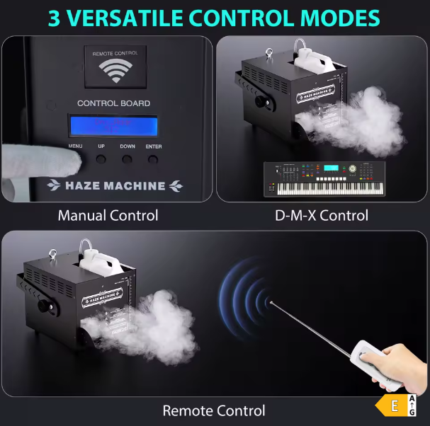 Diese kompakte Maschine bietet eine einfache Bedienung per Fernbedienung/DMX. Das umweltfreundliche, geruchsneutrale Design ist sicher und sauber. Sie ist extrem leise, verbraucht wenig Fluid und ist leicht zu transportieren. Sie verfügt über eine 10-stufige Nebel-/Windsteuerung, 5 einstellbare Auslässe und ein empfindliches ETS für schnelles Aufheizen und kontinuierlichen Nebelausstoß nach dem Aufwärmen.
